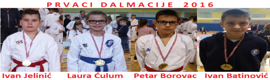 | Dana 14.02.2016.g. nastupili smo na Prvenstvu Dalmacije, sa 15 natjecatelja u borbama. Dobili smo 4 prvaka Dalmacije, dva viceprvaka i 7 trećeplasiranih. Zlata su osvojili: - IVAN JELINIĆ u kategoiji mađi učenici +38 kg, LAURA ĆULUM u kategoriji mlađe učenice -36 kg, PETAR BOROVAC u kategoriji mlađi kadeti -52 mlađi kadeti -52 kg. Ante je dogurao do finala, ali u finalu nije mogao nastupiti zbog povrede koju je zadobio tijekom prethodne borbe, te finale predao klupskom kolegi Petru Borovcu. Brončae medalje osvojili su: DUJE MIHALJEVIĆ u kategoriji ml.čenii -34 kg, LUCIJA UTOVAC u kategoriji učenice -44 kg, ANTE UTOVAC u kategoriji ml.kadeti -45kg, ANTE DUGANDŽIĆ u kategoriji ml.kadeti -48 g, ANTE JURAČIĆ u kategoriji ml.kadeti -48kg, IVA VUČIĆ u kategoriji ml. kadetkinje -45 kg i LUKAS GLAVIŠKIĆ u kategoeiji kadeti -63 kg. Nastupili su još Sara Đukić i Ema Vidović koje su ovaj put ostale bez medalje, te se plasirale na 5 mjesta. |