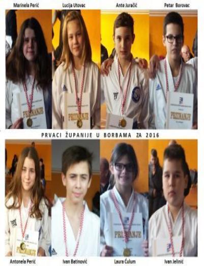 | Dana 14.02.2016.g. nastupili smo na Prvenstvu Dalmacije, sa 15 natjecatelja u borbama. Dobili smo 4 prvaka Dalmacije, dva viceprvaka i 7 trećeplasiranih. Zlata su osvojili: - IVAN JELINIĆ u kategoiji mađi učenici +38 kg, LAURA ĆULUM u kategoriji mlađe učenice -36 kg, PETAR BOROVAC u kategoriji mlađi kadeti -52 mlađi kadeti -52 kg. Ante je dogurao do finala, ali u finalu nije mogao nastupiti zbog povrede koju je zadobio tijekom prethodne borbe, te finale predao klupskom kolegi Petru Borovcu. Brončae medalje osvojili su: DUJE MIHALJEVIĆ u kategoriji ml.čenii -34 kg, LUCIJA UTOVAC u kategoriji učenice -44 kg, ANTE UTOVAC u kategoriji ml.kadeti -45kg, ANTE DUGANDŽIĆ u kategoriji ml.kadeti -48 g, ANTE JURAČIĆ u kategoriji ml.kadeti -48kg, IVA VUČIĆ u kategoriji ml. kadetkinje -45 kg i LUKAS GLAVIŠKIĆ u kategoeiji kadeti -63 kg. Nastupili su još Sara Đukić i Ema Vidović koje su ovaj put ostale bez medalje, te se plasirale na 5 mjesta. |